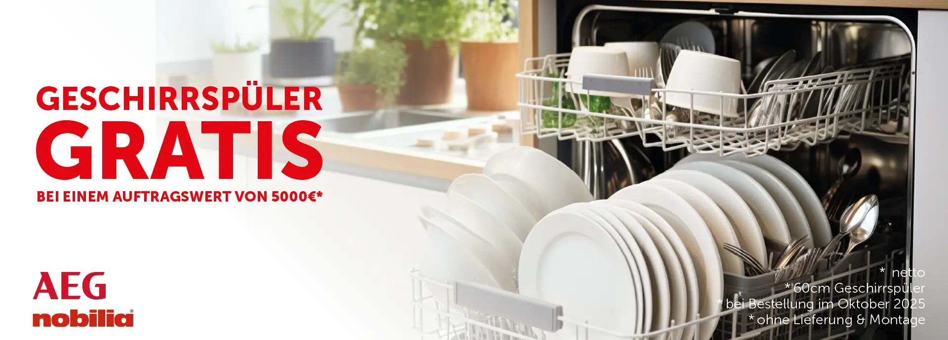 Beim Kauf einer nobilia Küche ab einem Auftragswert von 5.000 € netto (ohne Lieferung und Montage) erhalten Sie einen Geschirrspüler gratis dazu.