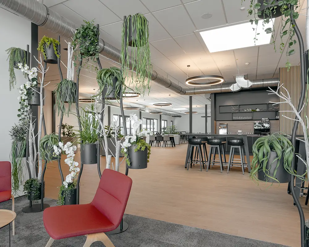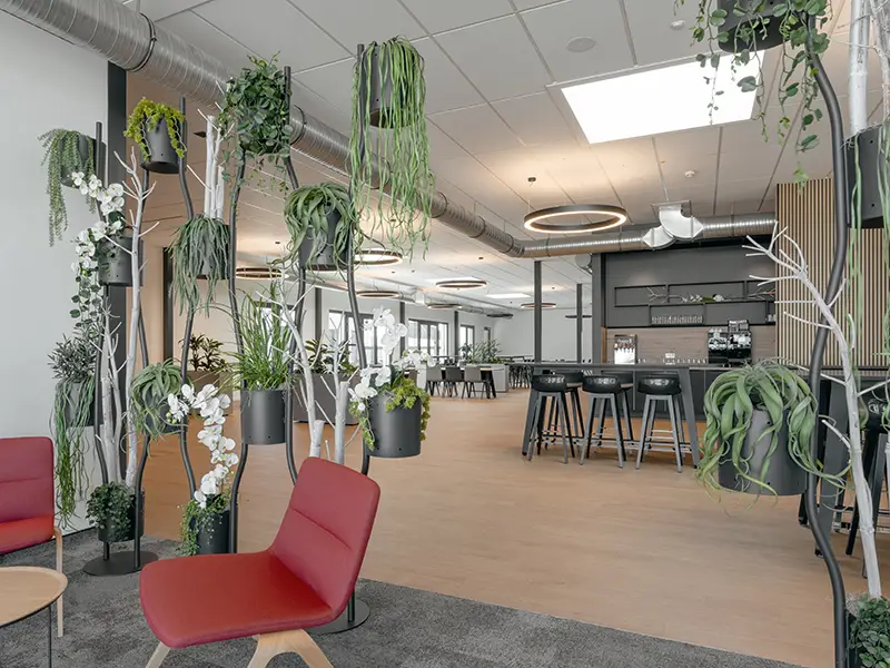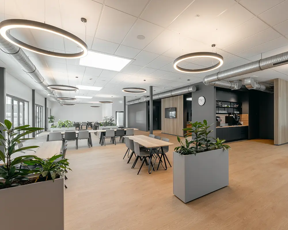 Im Mittelpunkt des Projekts stand die Kantine mit Lounge-Bereich als kommunikativer Treffpunkt für Mitarbeitende – nicht nur zum Essen, sondern auch zur Erholung, zum Austausch und für interne Veranstaltungen. Ergänzt wurde das Konzept durch zwei Konferenzräume, moderne Medientechnik sowie eine Sonnenterrasse mit Outdoor-Möblierung.