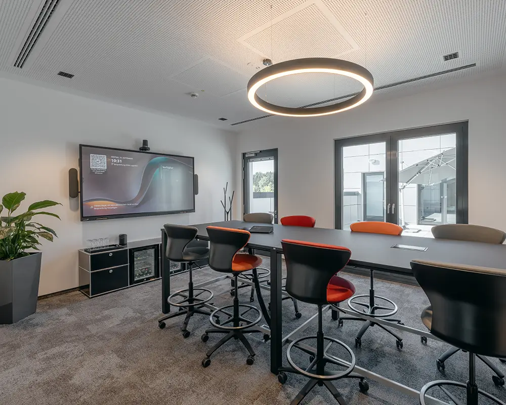 Ergänzt wird das Projekt durch zwei Konferenzräume – einen kleinen und einen großen – die mit moderner Medientechnik und USM-Möbeln inklusive integriertem Getränkekühlschrank ausgestattet sind.