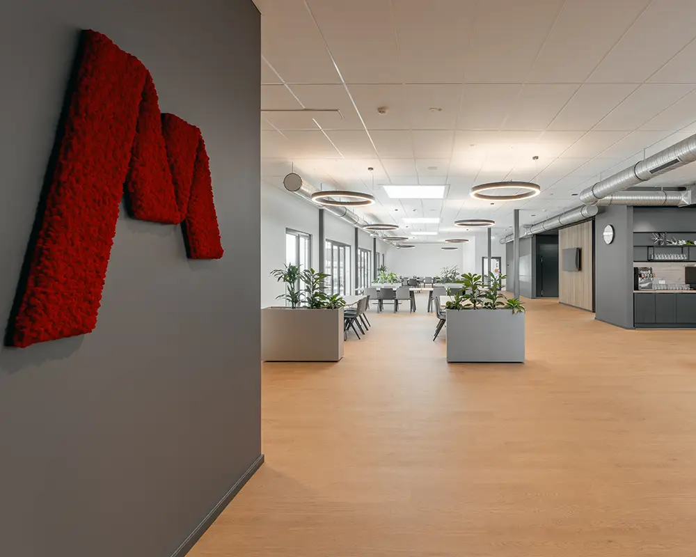 Individuelle Highlights wie ein eigens angefertigtes Moosbild im Markgraf-Logo unterstreichen die Corporate Identity und geben den Räumen eine persönliche Note.