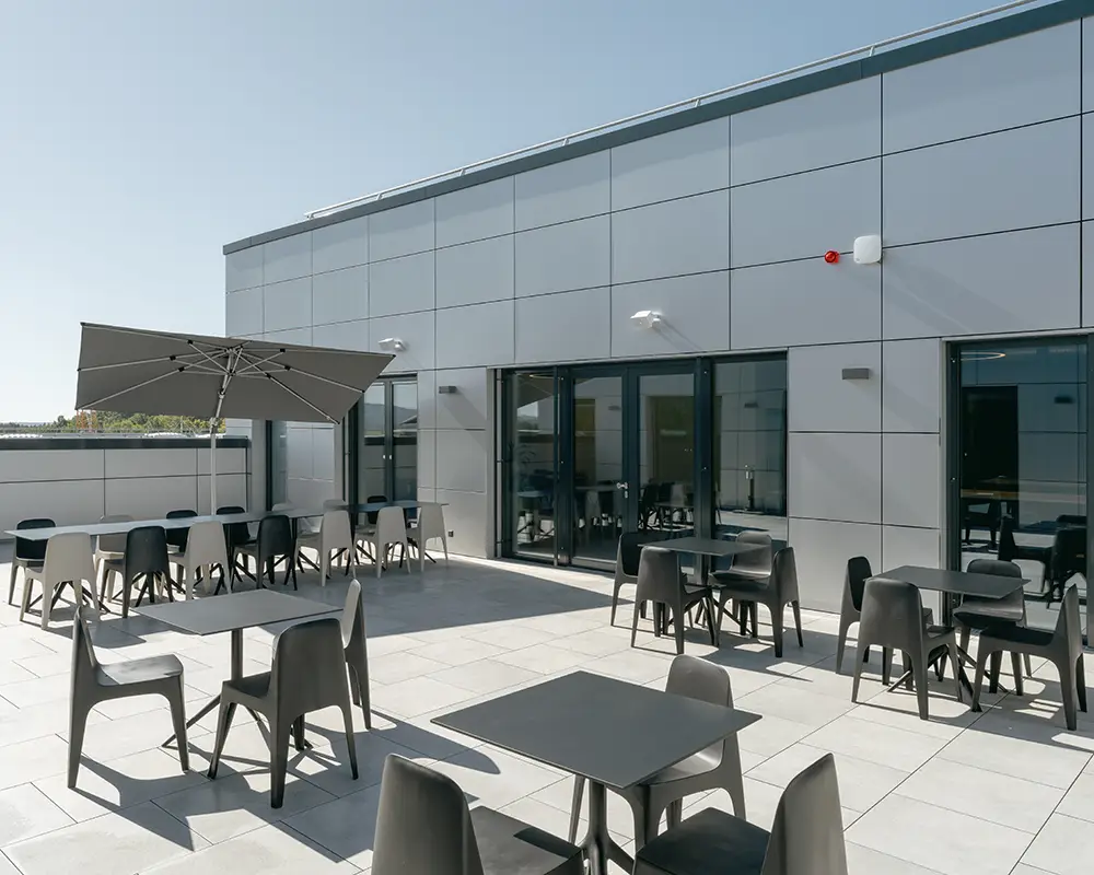 Für die Sommermonate sorgt die Sonnenterrasse mit hochwertigen Outdoor-Möbeln für eine entspannte Pausenzeit im Freien.